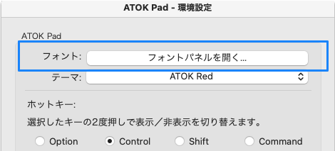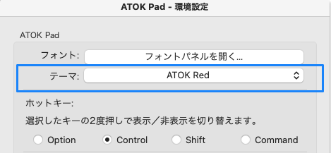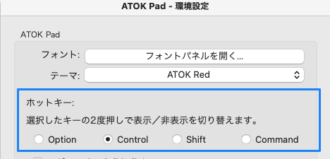 | Optionキー二度押し (他のキーに変更可能) | ATOK Padの起動 /終了 |
