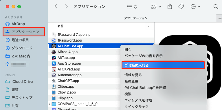 Finderでは「アプリケーション」フォルダを開き、対象のアプリをゴミ箱に移動してゴミ箱を空にするだけで完了します。