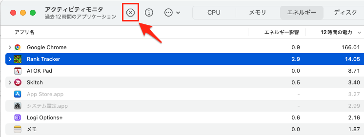 アプリが終了できないときは、アクティビティモニタを使って強制的に停止させましょう。