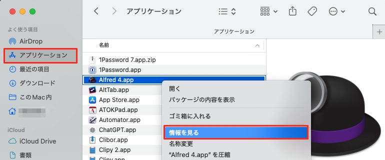 Finderで対象アプリを右クリックし「情報を見る」を選択し、「共有とアクセス権」で自分のユーザーを「読み/書き」に変更します。