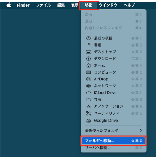 Finderのメニューバーで 「移動」 > 「フォルダへ移動」 をクリックします。