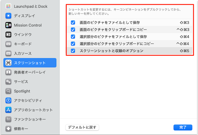 詳しくはシステム設定のキーボードショートカットを有効にする確認方法をご覧ください。