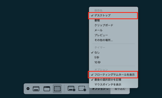 あわせて、保存先がデスクトップになっていることを確認してください。クリップボードだとフローティングサムネイルは表示されないので。